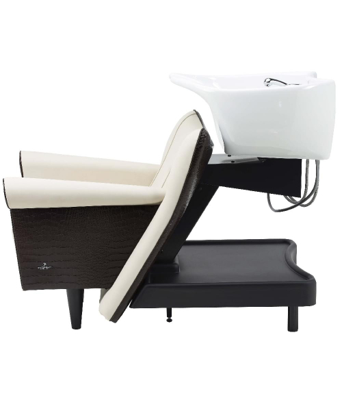 Мойка с креслом на металлическом каркасе черного цвета, сзади пластиковая полка. Комплектуется глубокой керамической раковиной белого или черного цвета, с регулировкой угла наклона, комплектом смесителя с хромированной лейкой душа. Каркас кресла выполнен из металла, мягкие элементы обтянуты искусственной кожей высшего качества, мягкие подлокотники. Размер (ДхШхВ): 120х68х93