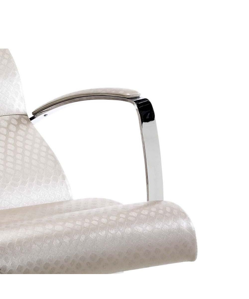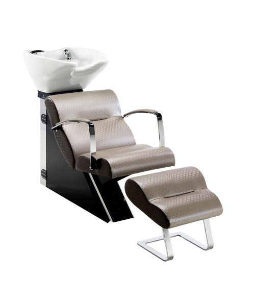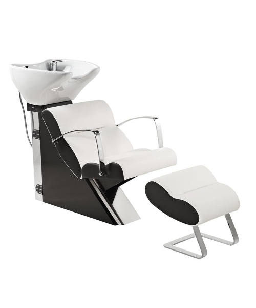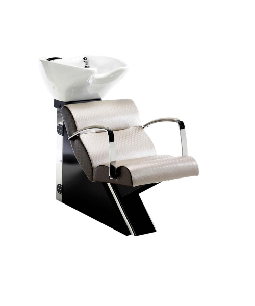 Мойка с креслом на алюминиевом каркасе с черными или серебряными боками. Комплектуется глубокой керамической раковиной белого или черного цвета, с регулировкой угла наклона, комплектом смесителя с хромированной лейкой душа. Каркас кресла выполнен из металла, мягкие элементы обтянуты искусственной кожей высшего качества, подлокотники хромированные или с декоративной накладкой из кожезама. Размер (ДхШхВ): 128х58х92