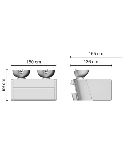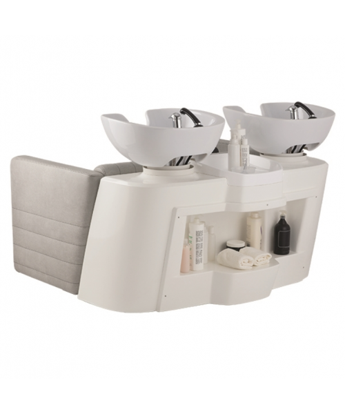 Парикмахерская мойка "DUETTO" с артикулом С-м60002516 - Подлокотники, сиденье и спинка из пенополиуретана с вставками из дерева и металла. Белая или черная конструкция из стекловолокна по запросу. Керамическая раковина с регулируемым шарниром.