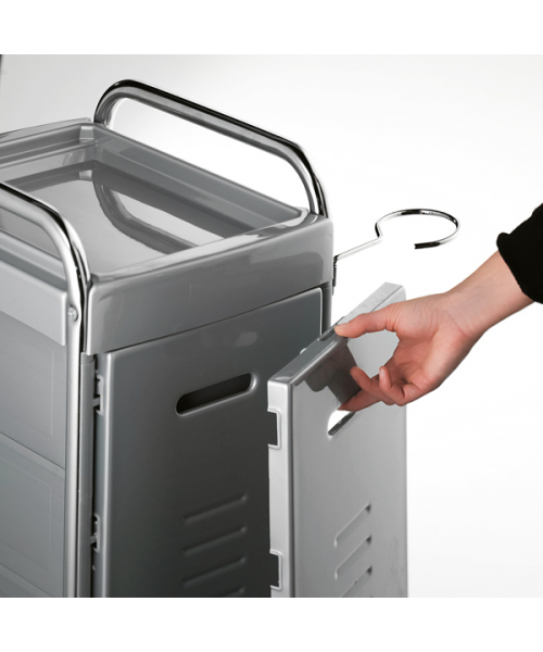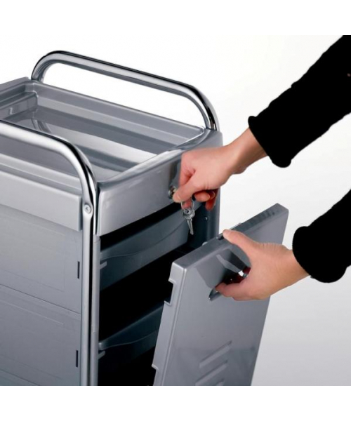 Тележка парикмахерская "KAPPA A clock" - закрытого типа на хромированном каркасе из прочного пластика с пятью выдвижными ящиками. Оснащена прорезиненными колесами для комфортного  и бесшумного перемещения и металлическим фенодержателем. Тележка с артикулом A-м60003047 закрывается противоскользящей панелью с ключом.