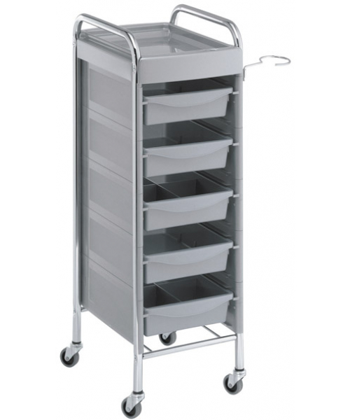 Тележка парикмахерская "KAPPA A" - на хромированном каркасе из прочного пластика с пятью выдвижными ящиками. Оснащена прорезиненными колесами для комфортного и бесшумного перемещения и металлическим фенодержателем.