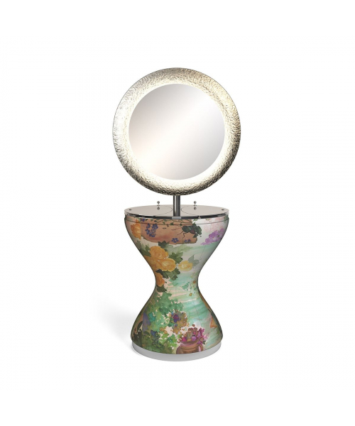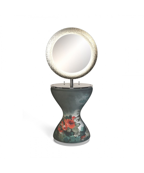 ИталияЗеркало парикмахерское "Miss Beauty" - со съемной тканевой обшивкой, круглым зеркалом с изогнутым назад элементом, отделанным листовым серебром. Светодиодная подсветка, электрическая розетка / USB-порт, двойной ящик для инструментов, выдвижной держатель для фена.