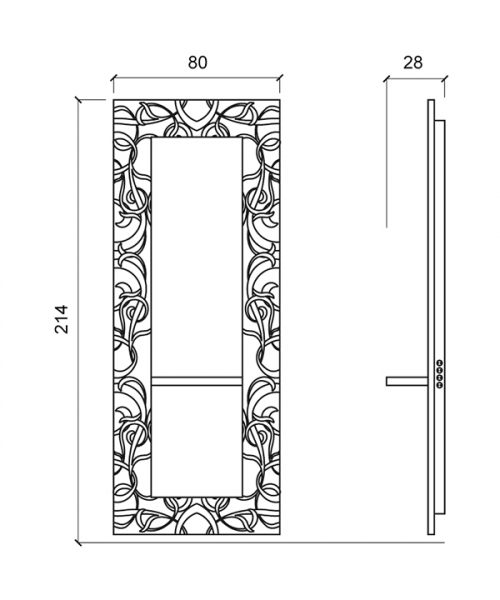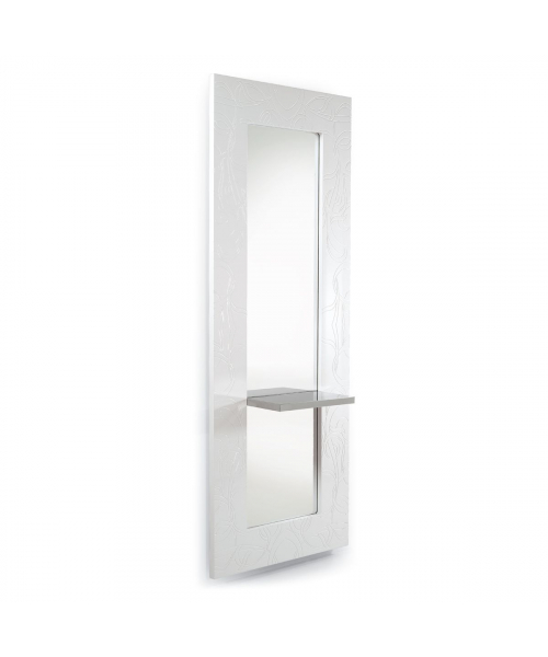 Зеркало парикмахерское "Parlor Wall" - с декоративной рамкой. Рама зеркала выполнена из глянцевого акрила черного или белого цвета с рисунком. Зеркало оснащено металлической хромированной столешницей. Крепление к стене.