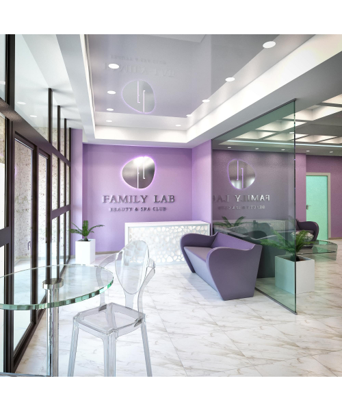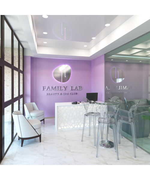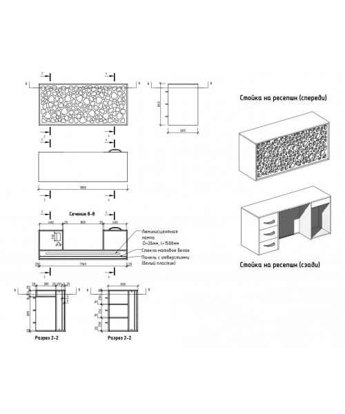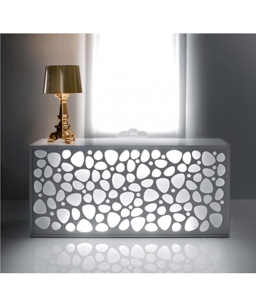 Рецепция выполнена из ламината белого цвета, с фасадом из белого оргстекла с подсветкой.