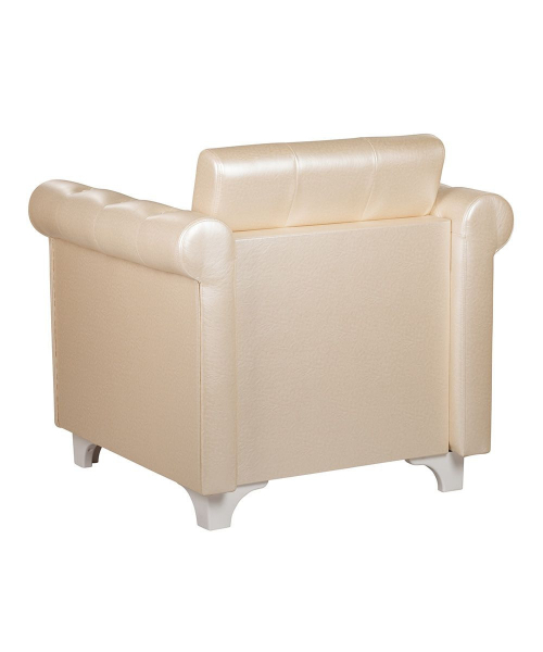 Комфортабельное кресло для холла Соната с мягкими широкими подлокотниками и удобной спинкой, декоративные пуговицы расположены на спинке, внешней части подлокотника и нижней части сиденья, опоры пластиковые белого цвета.