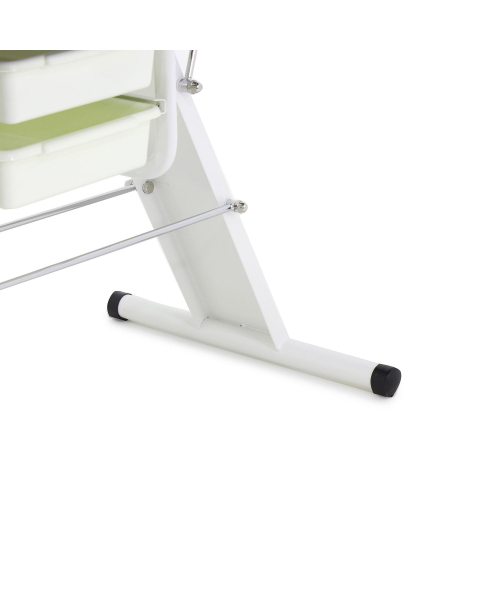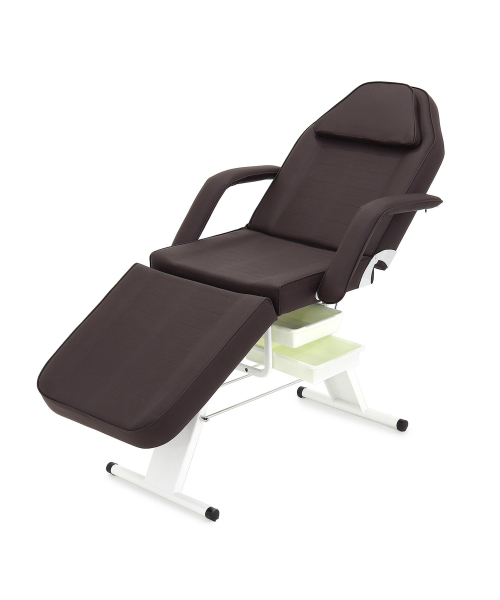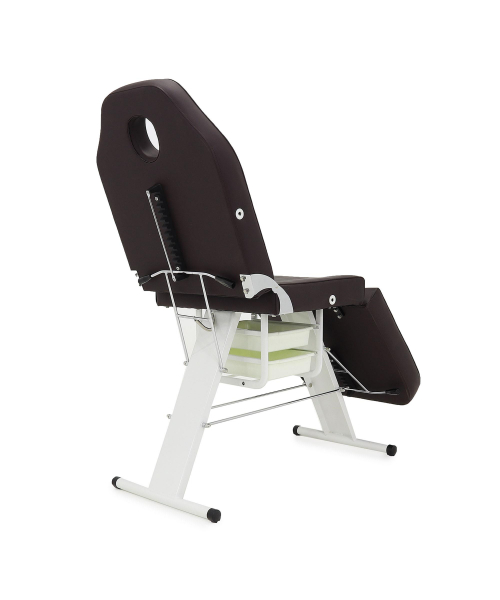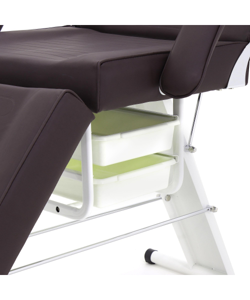 Кресло может принимать горизонтальное положение - это превращает ее в кушетку, что позволяет проводить процедуры косметологического массажа. Отличительной особенностью данной модели является наличие полок, которые располагаются непосредственно под сидением кресла.