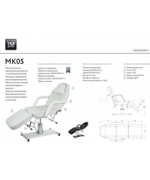 КитайКушетка косметологическая, кресло "MK05 MATERA" ,Функциональное трех-секционное оснащено гидравликой. для регулировки высоты. Каркас - металлическая рама. Наклон спинки и ножной части регулируется вручную.