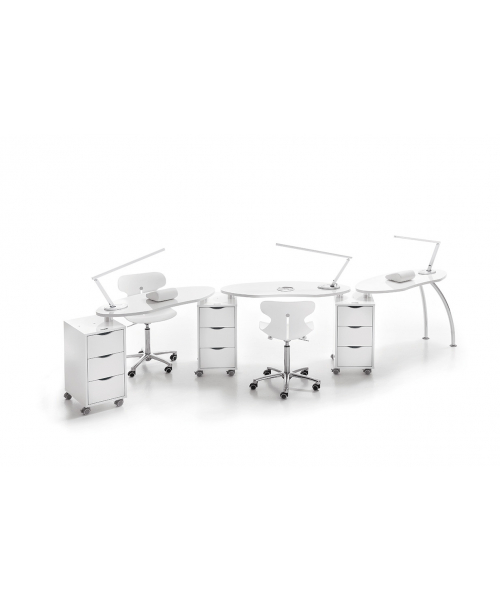 ИталияМаникюрный стол "NAIL BRIO" - может использоваться как полноценная единица или же входить в состав модульной системы. Основание стола изготовлено из плит с меламиновым покрытием. Дополнительно стол комплектуется комодами на колесиках с тремя выдвигающимися шкафчиками.