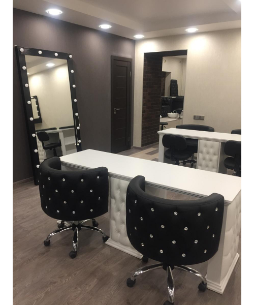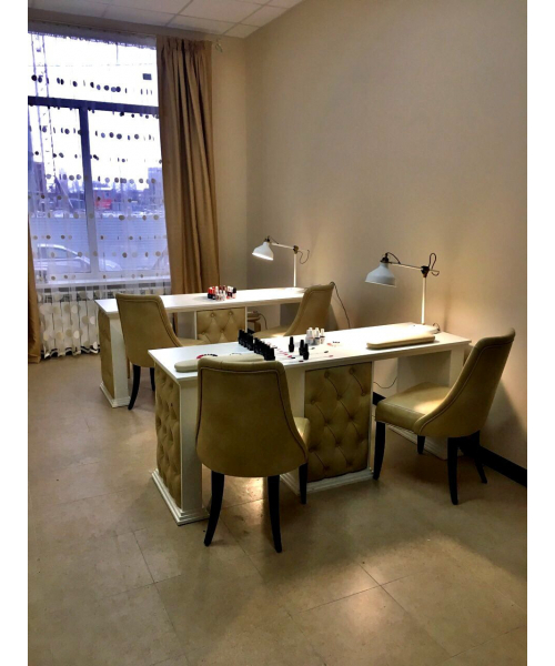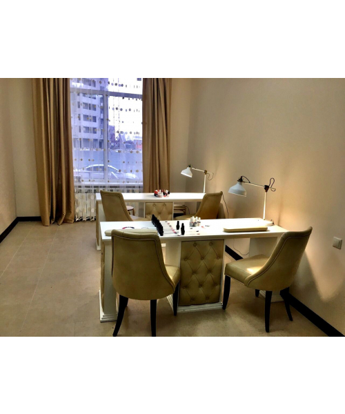Маникюрный стол для двух мастеров с каретной стяжкой на одной ноге и тумбе. Размер 1800х550х740-48 мм.