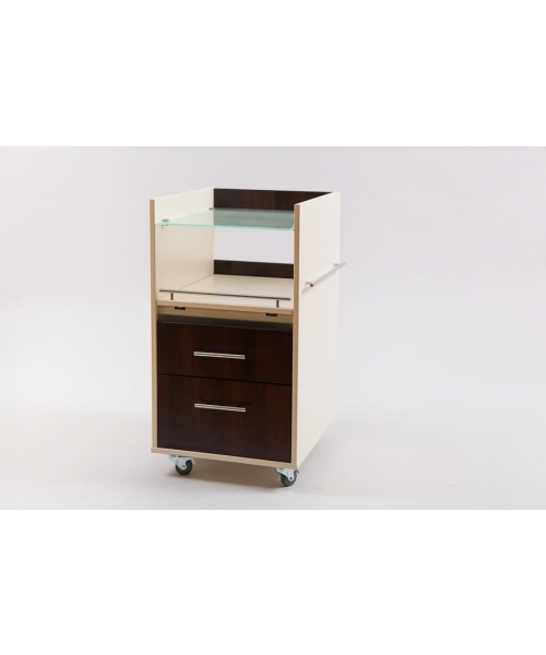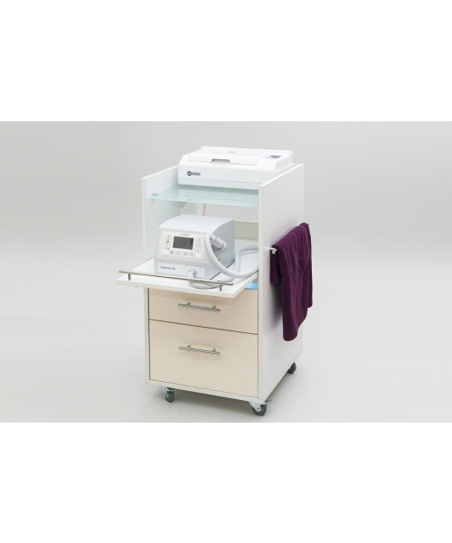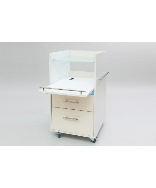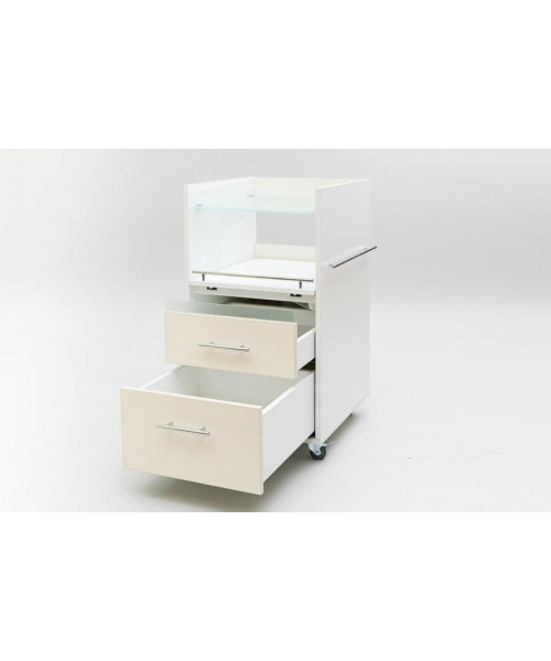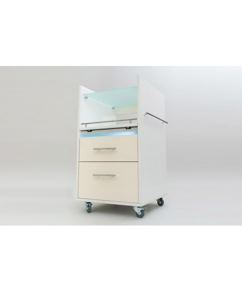 Компактная тележка Кубика является устойчивой, вместительной и многофункциональной моделью. Изделие имеет форму тумбы на колесиках с полувыдвижной полкой для аппаратуры, верхний ящик оснащен УФ-модулем с бактерицидной лампой для стерилизации инструментов. В ней вы сможете хранить необходимое для работы оборудование, сэкономив пространство кабинета и обустроив свое рабочее место под свои требования. Правая стенка тележки оснащена рейлингом для полотенец.