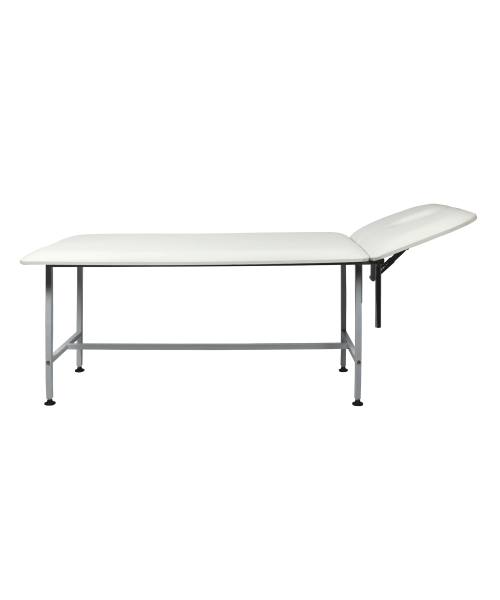 Неоспоримым преимуществом данной модели кушетки является надежный металлический каркас, который обеспечивает необходимую устойчивость даже при больших нагрузках. Для защиты от коррозии он окрашен порошковой краской белого цвета. Ножки каркаса установлены на специальные подпятники. Учитывая специфику массажных процедур, в подголовнике кушетки предусмотрено отверстие для лица. Для дополнительного удобства клиентов мастер сможет отрегулировать наклон подголовника с помощью механического рычага.