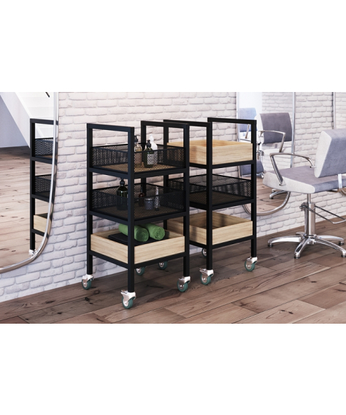 Парикмахерская тележка "Ironic Rack 1" - изготовлена из качественной высокопрочной стали и влагостойкого ЛДСП. Модель оснащена тремя глубокими ящиками и прорезиненными колесными опорами со стопорами, снижающими уровень шума при передвижении.