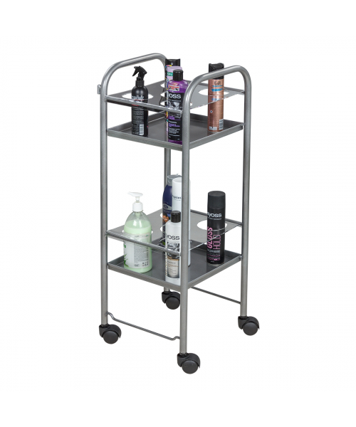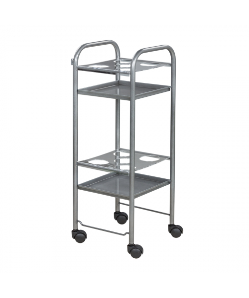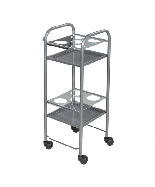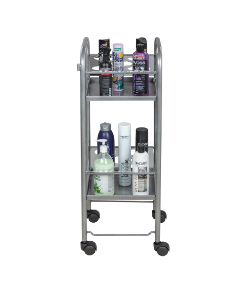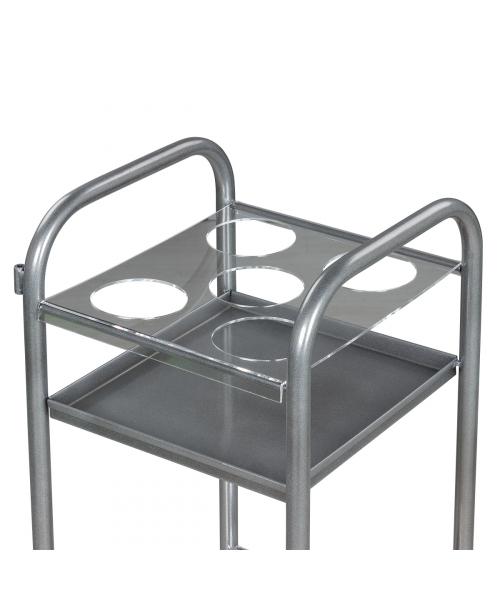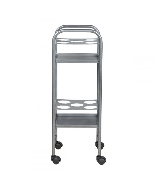 Парикмахерская тележка включает 2 полки, на которых предусмотрено по 5 отверстий для высоких флаконов. Верхние панели над полками съемные, поэтому данную модель можно использовать как обычную тележку. В конструкции нет боковых стенок, благодаря чему можно воспользоваться необходимыми средствами с любой стороны. Наличие вращающихся колес позволяет легко и плавно перемещать парикмахерское оборудование по рабочей зоне. Передвигая тележку, можно не переживать за напольное покрытие, так как колесики из пластика не повредят его.