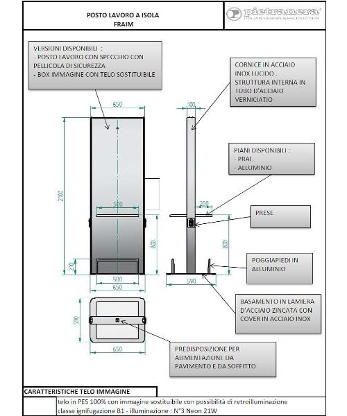 951 - Двусторонний рабочий туалет, крепление к полу. С одной стороны парикмахерское зеркало: столешница из алюминия или из белого матового ламината Pral, металлическая подставка для ног. С другой стороны витрина со стекляными полками и выбранным клиентом изображением.