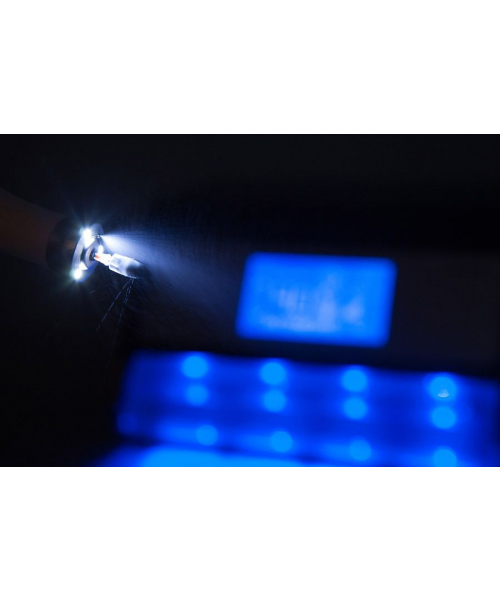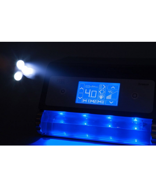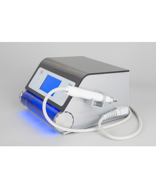 Аппарат отличается функцией спрея и наконечником со встроенной LED подсветкой с тремя светодиодами. Все настройки педикюрного аппарата регулируются при помощи сенсорного дисплея на лицевой панели. Модель оснащена тремя настраиваемыми ячейками памяти для быстрого перехода к собственным настройкам скорости вращения фрезы и интенсивности спрея.