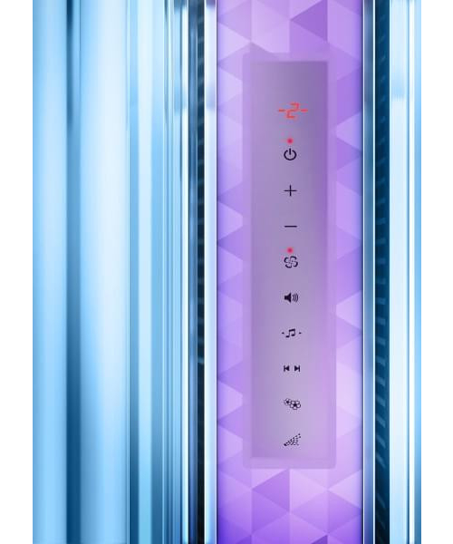 • Удобная навигация сенсорной панели Smart Touch, которая отлично защищенная от воздействия внешних факторов акриловым стеклом Специальная настраиваемая в три этапа система вентиляции позволяет создать самые комфортные температурные условия во время сеанса загара. Поток воздуха идеальной силы и температуры обдувает тело, тем самым обеспечивая комфортные условия во время сеанса загара, а также великолепный загар!