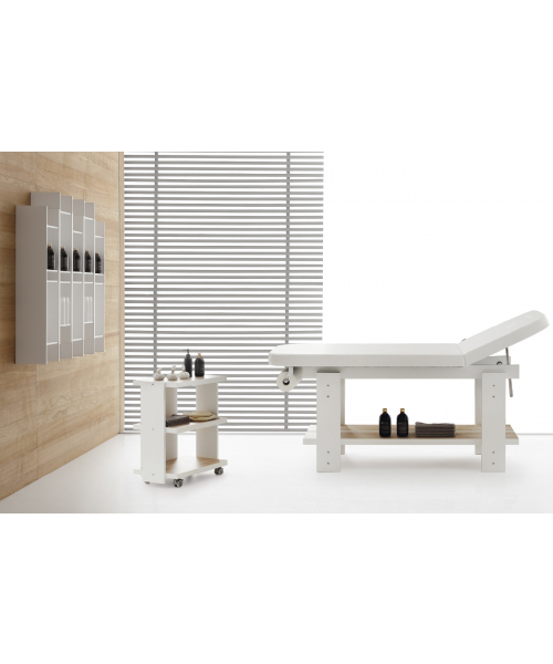 Массажная кушетка "Living" -  это массажная кровать, выполненная в матово-белом цвете с полкой на основании, доступной в трех различных вариантах отделки.