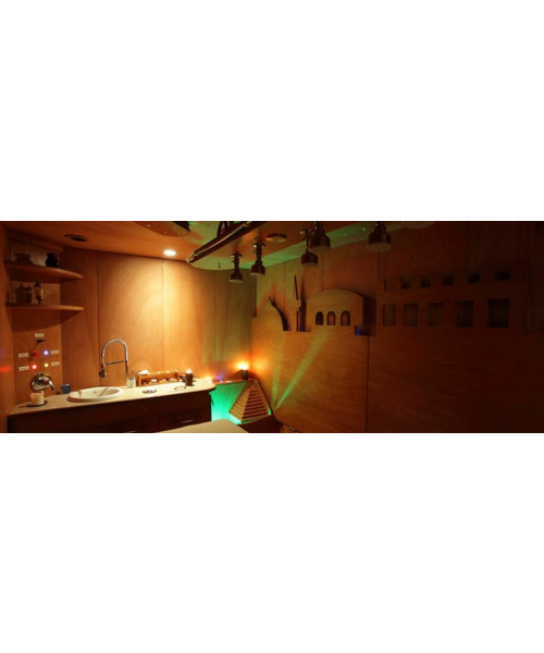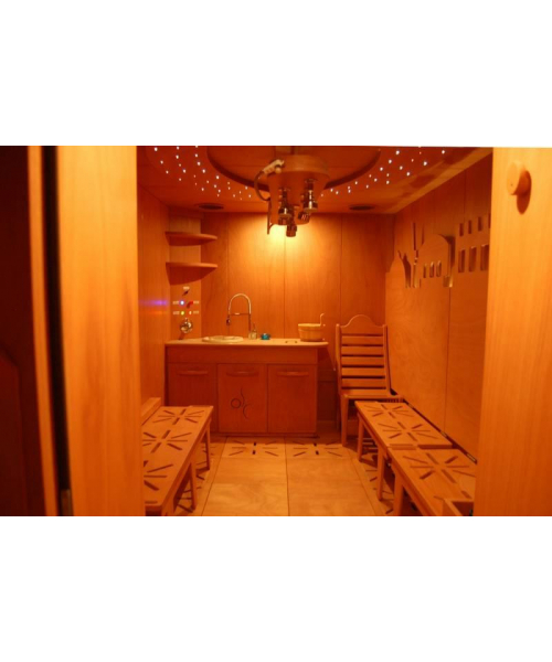 Внутреннее оснащение: хромотерапия – потолочная и настенная, аффузионный душ (душ Виши), тропический душ, лаборатория из дерева со встроенным электронагревателем для грязей с термостатом, встроенные складные боковые скамейки, декоративный водопад, аюрведическая кушетка.